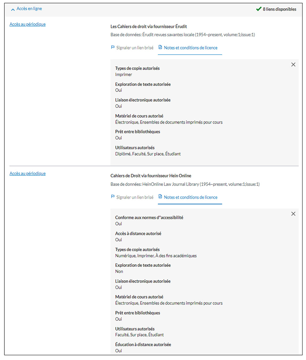 - Pour afficher les permissions variables selon le fournisseur, cliquez sur la mention « Notes et conditions de licence », qui se trouve dans la section « Accès en ligne » de la notice détaillée.